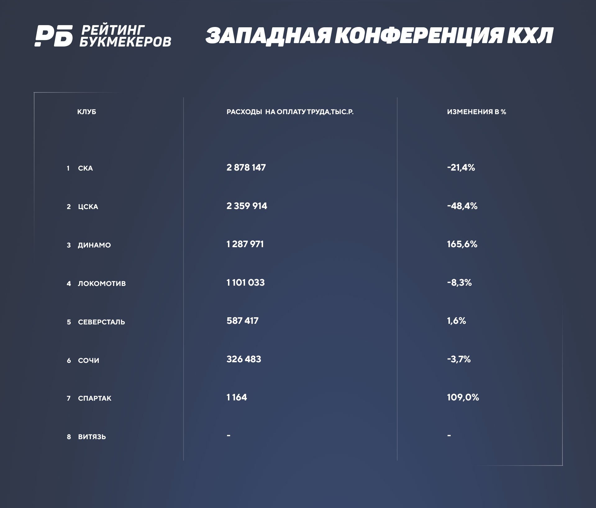 Самые большие расходы на оплату труда у петербургского СКА (2,9 млрд рублей), «Авангарда» (2,5 млрд) и ЦСКА (2,4 млрд рублей).