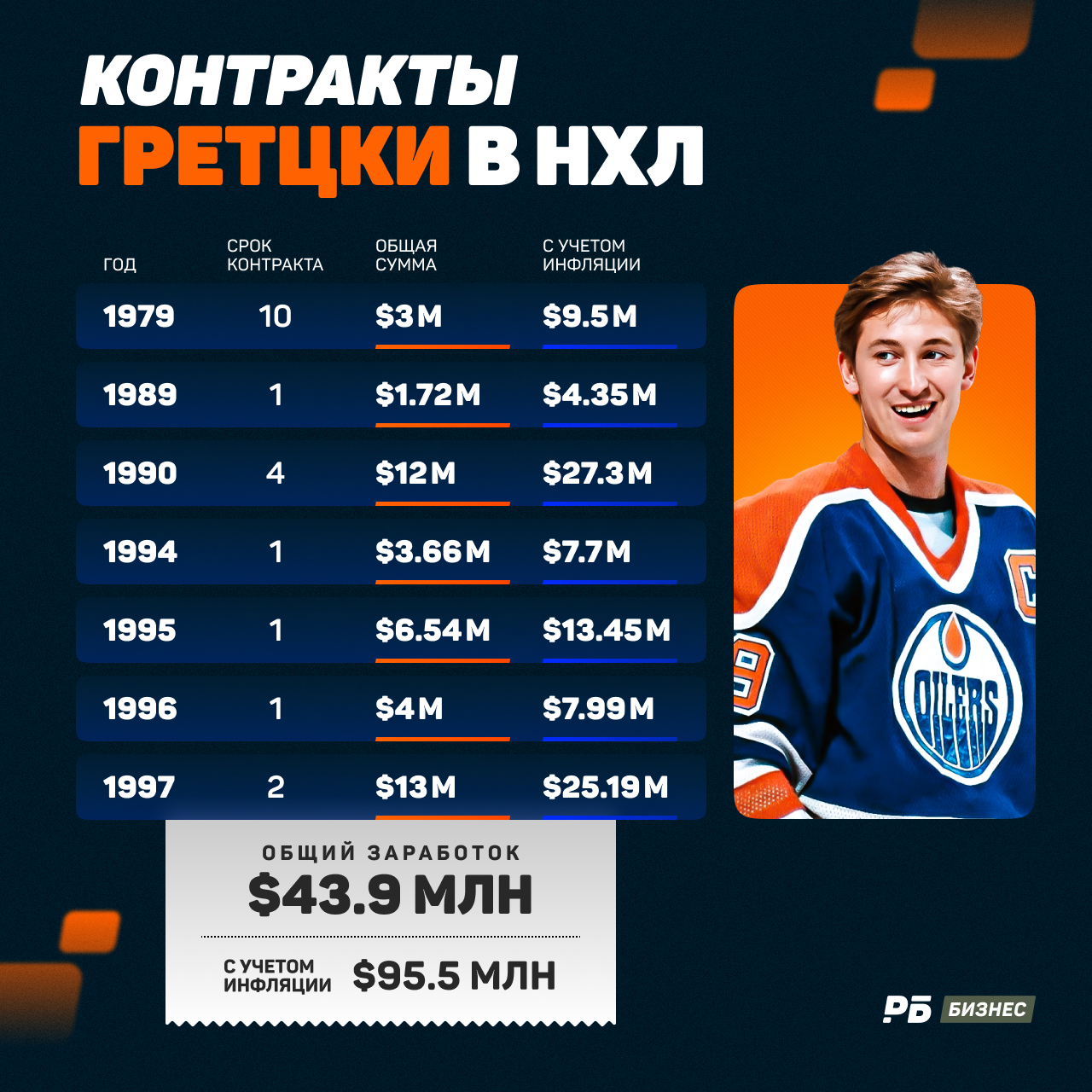 Всего за 20 лет в лиге Гретцки заработал $43,9 млн. Если учитывать инфляцию, то на нынешние деньги это $95,5 млн. Мощно! Но все равно меньше, чем у Овечкина.