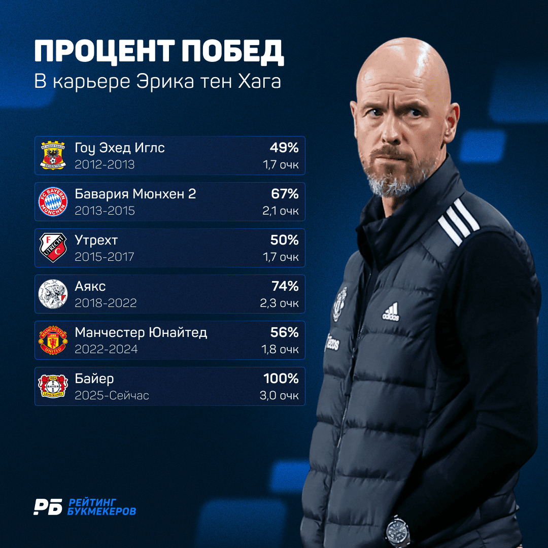 В «Манчестер Юнайтед» тен Хаг набирал в среднем 1,84 очка за матч. Если в Бундеслиге останется такой же график (63 очка в 34 турах), то это третье место максимум (в прошлом сезоне вторая команда набрала 69 очков, третья — 60).