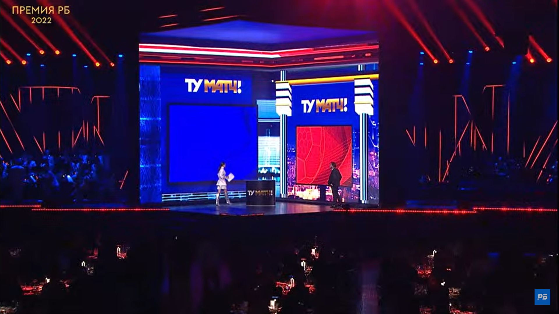 21:05. Объявляют первых победителей. В номинации «Лучшее спортивное СМИ» награду получил телеканал «Матч ТВ»! На сцену Премии РБ 2022 поднялся генпродюсер канала Александр Тащин!