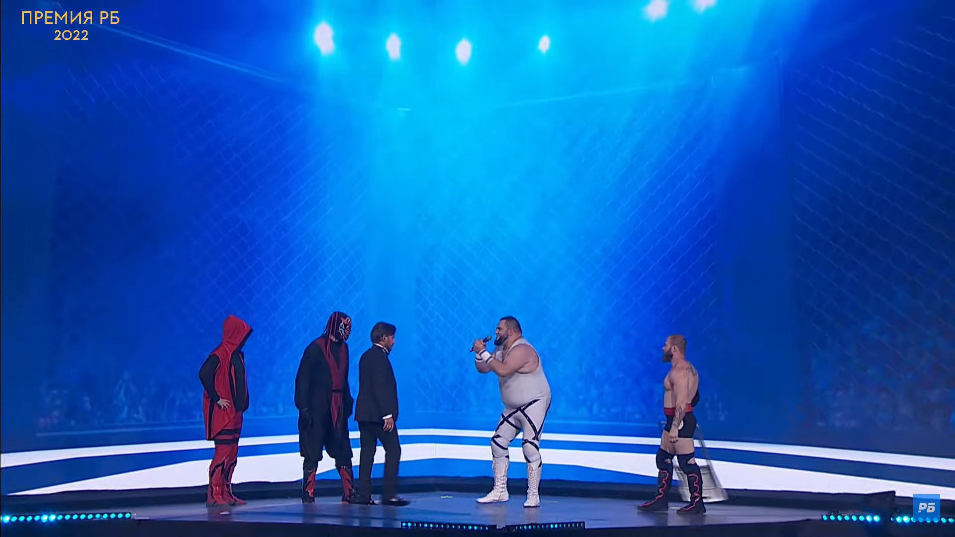 22:00. Ого, смотрите, какое представление перед объявлением номинации лучшей поп-ММА-лиги. Рядом с Башкатовым стоят будущие соперники Александра Емельяненко и Вячеслава Дацика, хех.