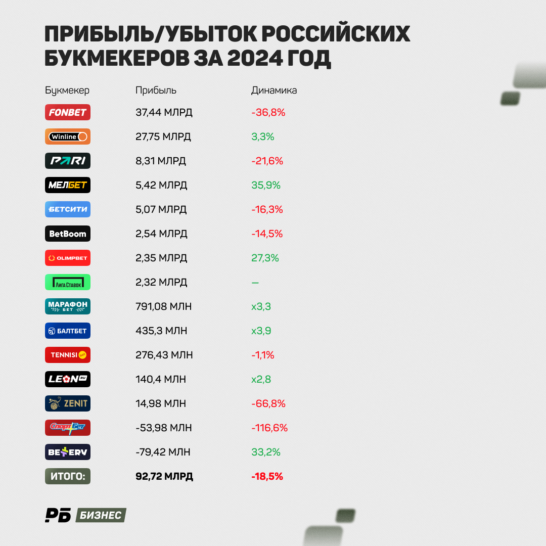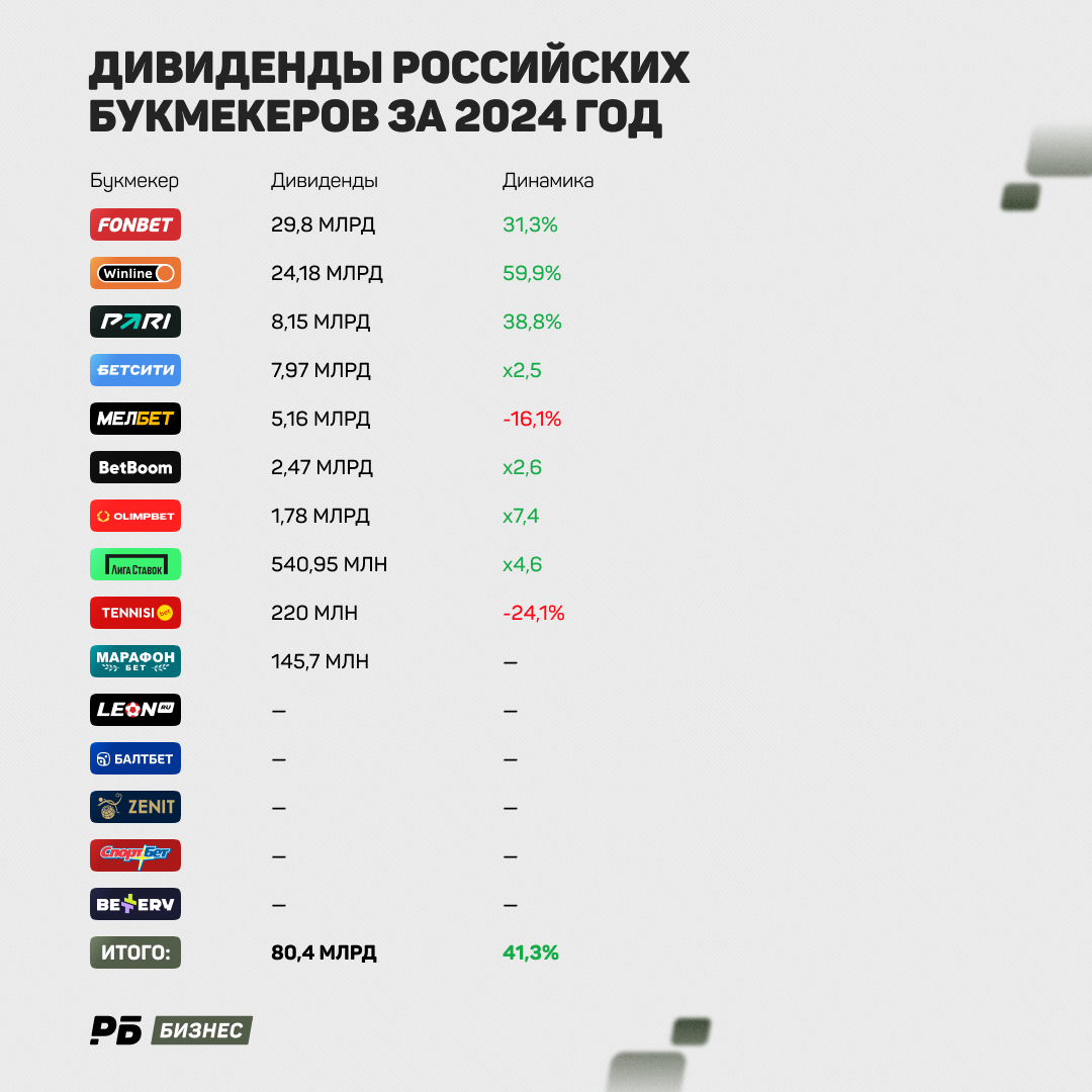 Также «РБ Бизнес» посчитал, что по итогам 2024 года российские букмекеры выплатили порядка 80,4 млрд рублей дивидендов – на 41,3% больше, чем годом ранее.