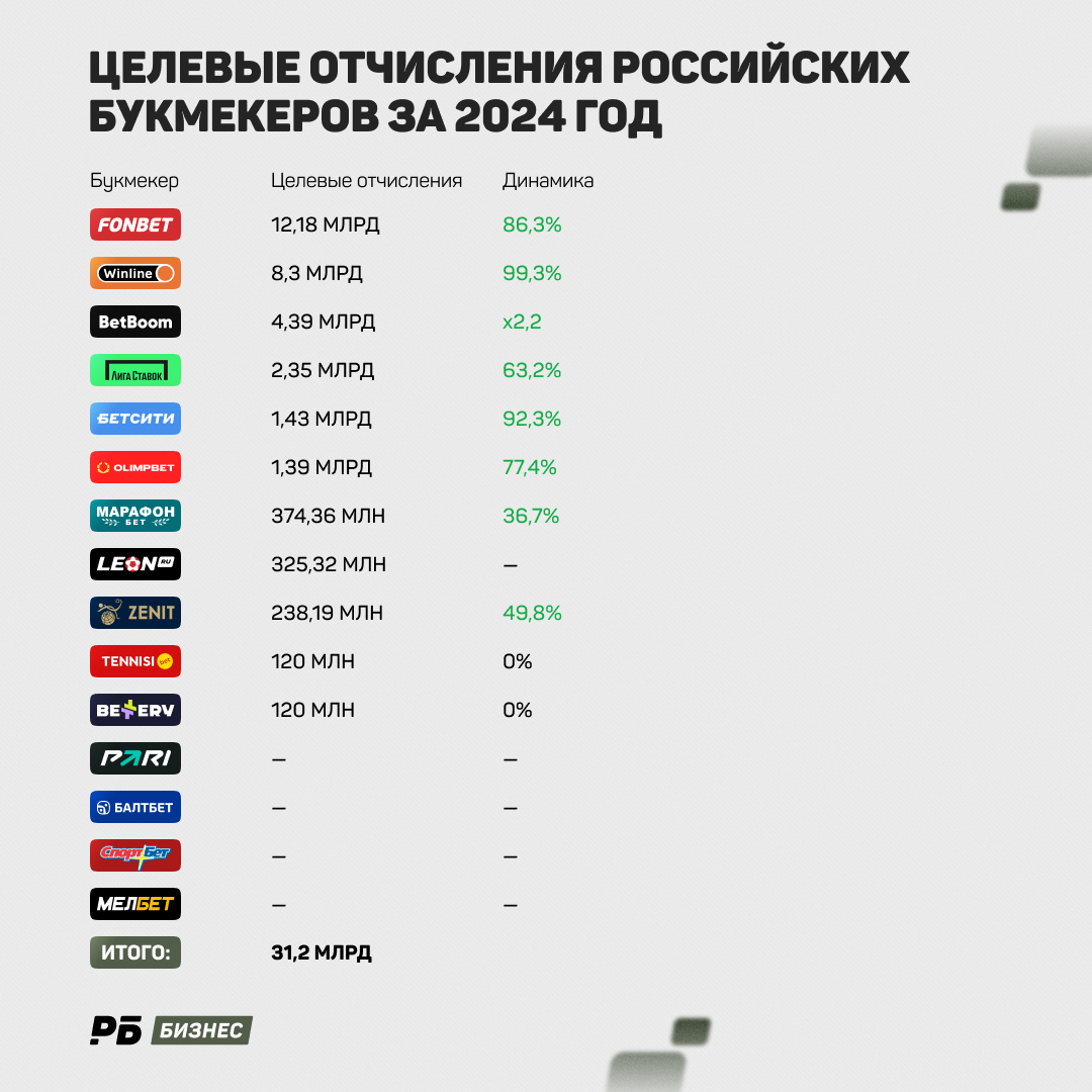 Ряд букмекеров опубликовали объем выплаченных целевых отчислений. Больше всех отчислений выплатил «Фонбет» – 12,8 млрд рублей.