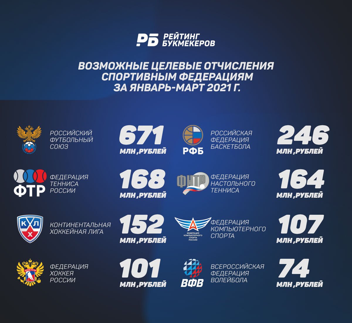 | Континентальная хоккейная лига | 74 430 943,86 ₽ |