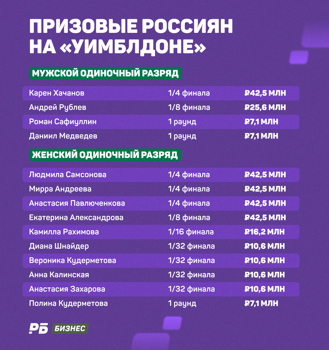 Кстати, «Уимблдон» сложился для россиян гораздо удачнее, чем «Ролан Гаррос». Тогда российские теннисисты заработали около 250 млн рублей. Почти на 100 млн рублей меньше, чем на «Уимблдоне».Сохрани РБ в избранное