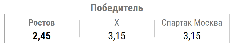 БК «Лига Ставок» считает хозяев фаворитами матча и оценивает их шансы коэффициентом 2,45, что соответствует 40-процентной вероятности. Поставить на «Спартак» можно за 3,15, аналогичным коэффициентом оценивается и ничейный результат. В процентах вероятности это 31%.