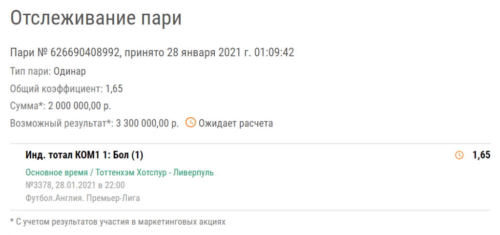 Игрок букмекерской компании «Лига Ставок» заключил пари на заключительный матч 20-го тура АПЛ между «Тоттенхэмом» и «Ливерпулем». Он поставил целых 2 000 000 ₽, а коэффициент пари составил 1,65. Вот эта ставка: