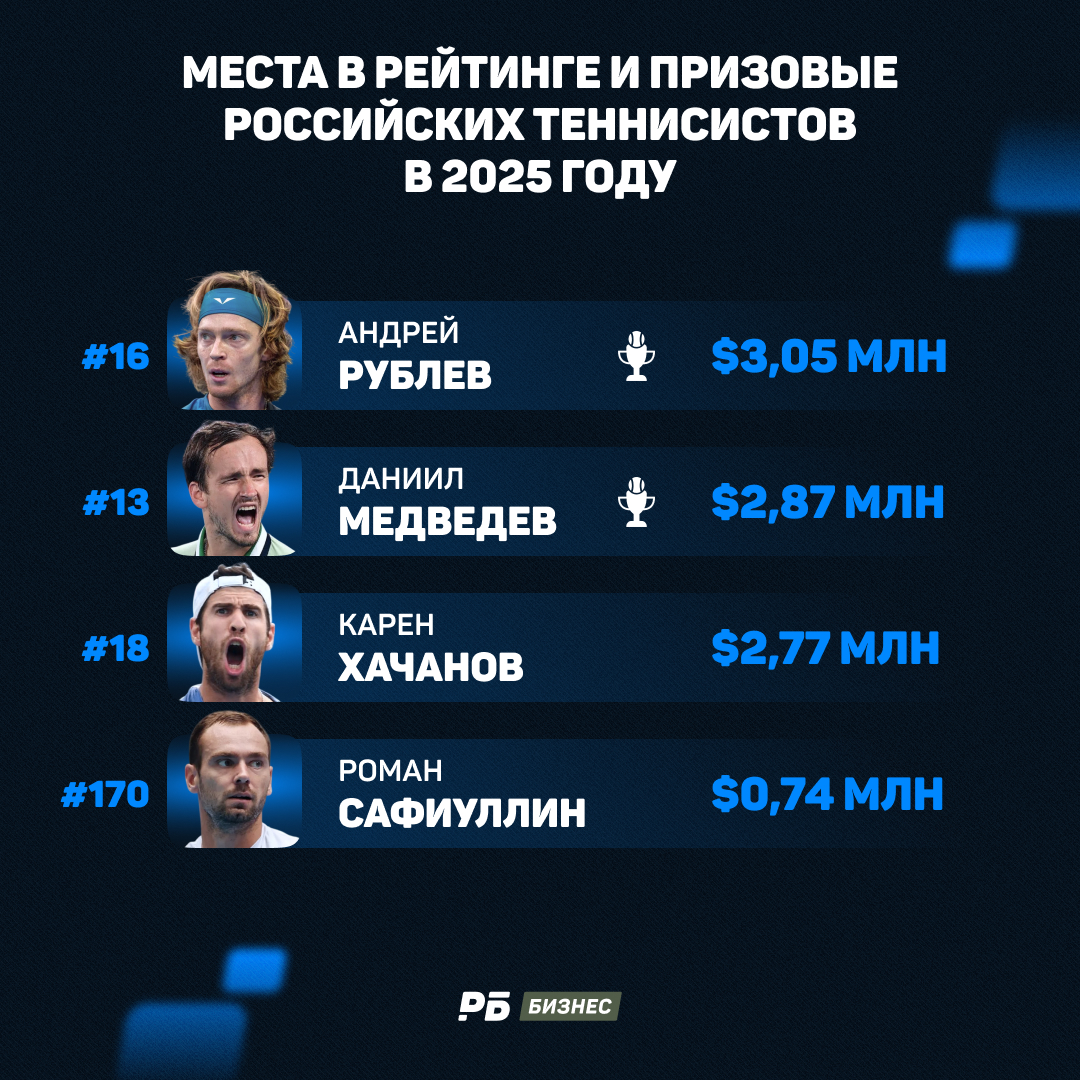По призовым лучшим стал Андрей Рублев. С начала года он потерял в рейтинге аж семь позиций: упал с 9-й строчки на 16-ю. Но, тем не менее, заработал более $3 млн. Самым прибыльным для Рублева стал турнир в Дохе, который он выиграл. Призовые за победу составили $500 тысяч.
