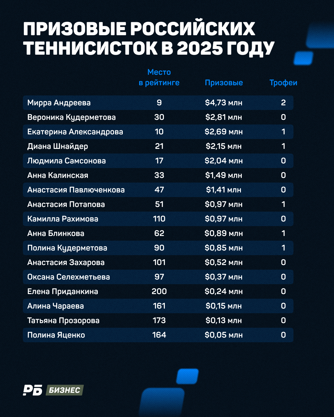 Самой высокооплачиваемой оказалась Мирра Андреева: на ее счету два трофея и $4,73 млн призовых. Лучшим для Андреевой оказался «тысячник» в Индиан-Уэллсе. По пути к трофею россиянка одолела Игу Швентек и Арину Соболенко, а в итоге забрала чек на $1,13 млн.