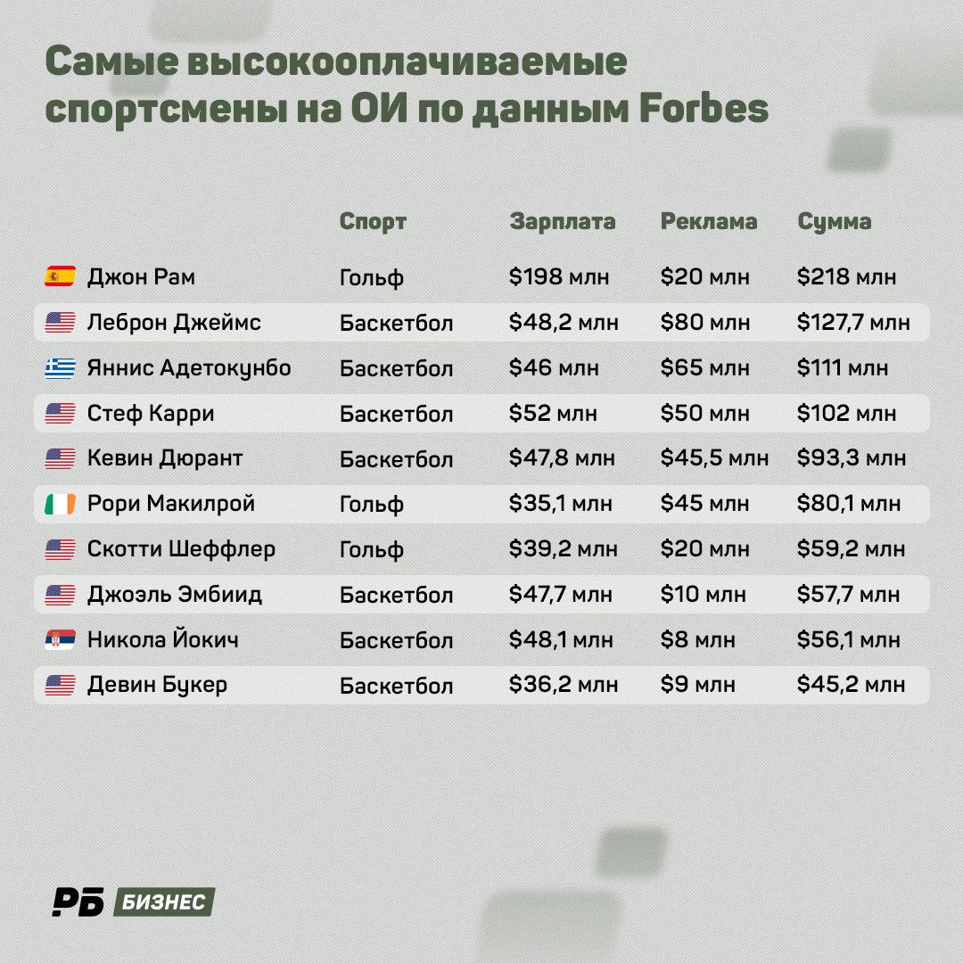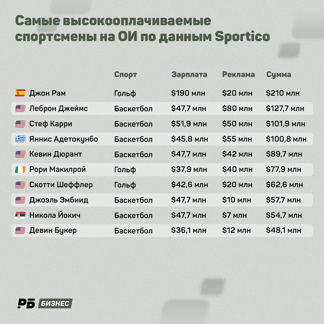 В обоих рейтингах присутствуют только два вида спорта: баскетбол и гольф. С баскетболом все понятно: сборная США привезла дрим-тим из суперзвезд НБА с огромными зарплатами (но есть единичные примеры из двух других сборных).