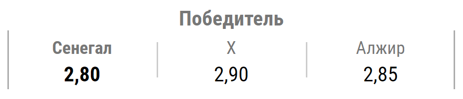 Аналитики оценивают шансы обеих команд практически одинаково, однако сборная Сенегала все же имеет небольшое преимущество в линии. Так, БК «Лига Ставок» дает на победу «львов Теранги» коэффициент 2,8, что соответствует 36-процентной вероятности. Поставить на сборную Алжира можно за 2,85. В процентах вероятности это 35%. Шанс ничьей оценивается коэффициентом 2,9 (вероятность 34%).