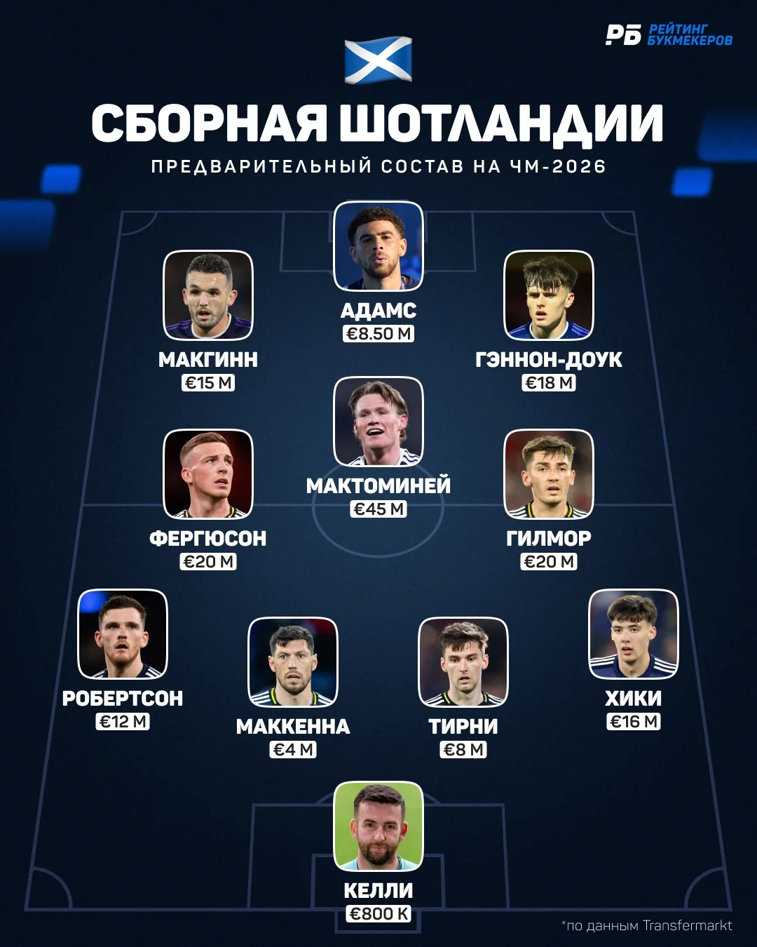 Суммарная стоимость состава Шотландии по оценкам портала transfermarkt составляет 214 млн евро.