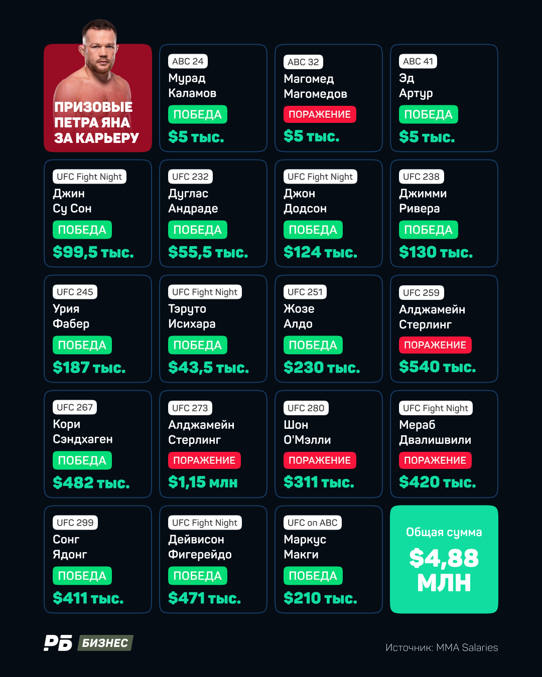 «Пётр сказал, что сумма, с которой он был бы готов завершить свою карьеру, составляет $5 млн. Я думаю, что $5 млн за карьеру он точно заработает. Это минимум и самая низкая планка. Можно заработать больше», – говорил Саят Абдрахманов.Больше Ян точно заработает. Сообщается, что поединок с Двалишвили принесет Яну около $500 тыс. Таким образом, российский боец уже сегодня ночью незначительно, но превзойдет минимальную программу по карьере. Сам грузин за защиту титула сможет заработать порядка $2 млн. Причем это даже не самый большой гонорар Двалишвили в UFC: ранее он зарабатывал $2,34 млн за один поединок.