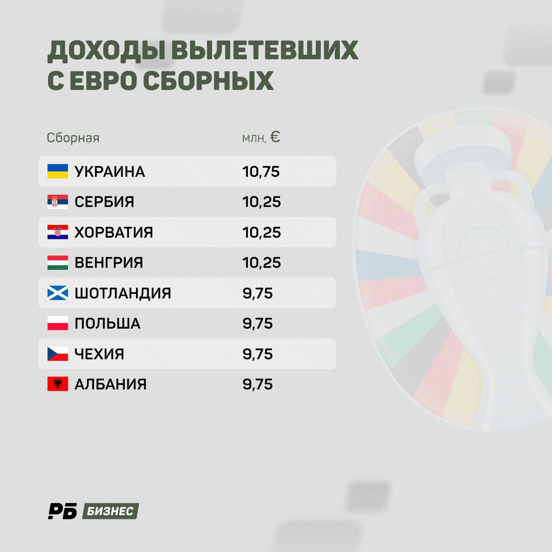 Три сборные получили до €10,25 млн: Сербия, Хорватия, Венгрия. Сербы и хорваты набрали всего два очка (две ничьи), за что дополнительно получили по €1 млн к базовым €9,25 млн.