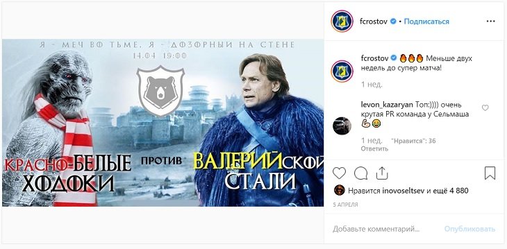 Ростовчане шикарно оформили матч в стиле «Игры престолов» – главного сериала современности. Через семь часов после игры вышла первая серия финального сезона, через семь дней после победы «Ростова» над «Спартаком» запустится один из топовых сериалов концовки сезона РПЛ: Валерийская сталь Карпина против Красно-белых ходоков в борьбе за Лигу Европы.