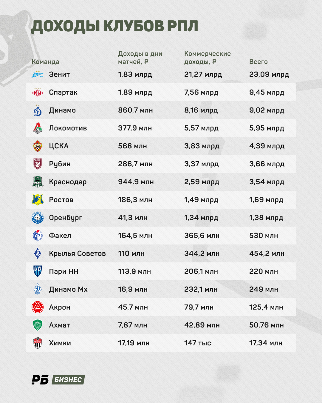 При этом «красно-белые» стали первыми по заработку на болельщиках: доход «Спартака» в дни матчей составил 1,89 млрд рублей. Ближе всего к «спартаковцам» подобрались «Зенит» (1,83 млрд рублей) и «Краснодар» (944 млн рублей).