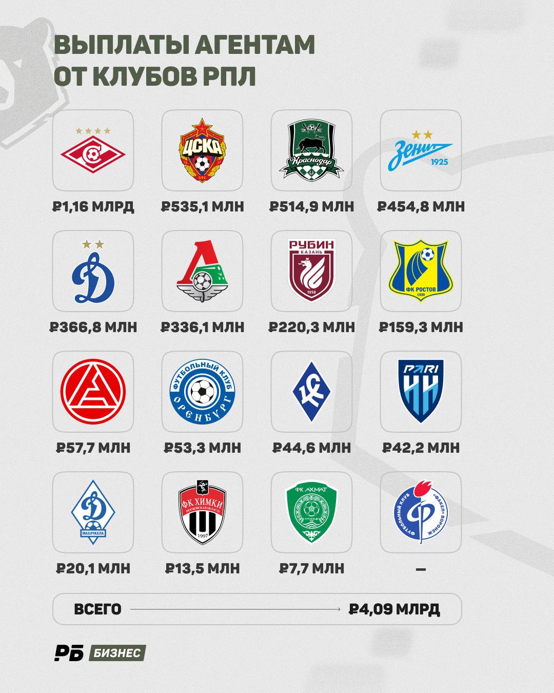 Суммарно все 16 клубов Российской премьер-лиги (РПЛ) заплатили агентам более 4 млрд рублей: в среднем по 255 млн рублей на команду.Сохрани РБ в избранное