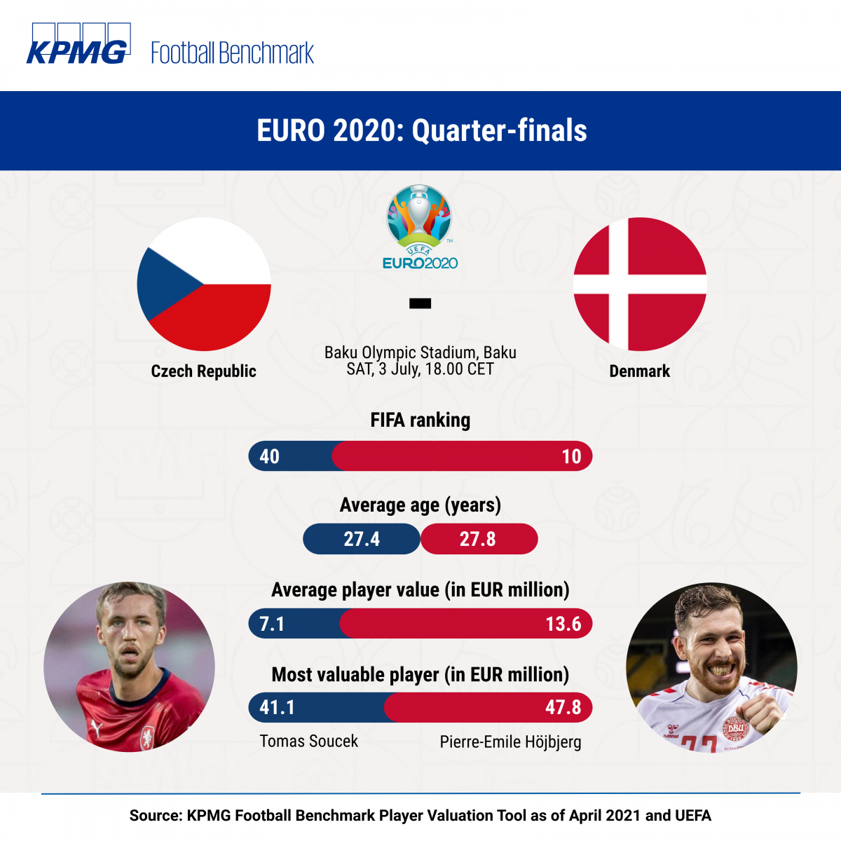 Средняя стоимость футболистов сборной Чехии составляет €7,1 млн, что вдвое меньше, чем показатель датской команды (€13,6 млн). Самый дорогой футболист в составе сборной Чехии – Томаш Соучек (€41,1 млн), у Дании – Пьер-Эмиль Хейберг (€47,8 млн).