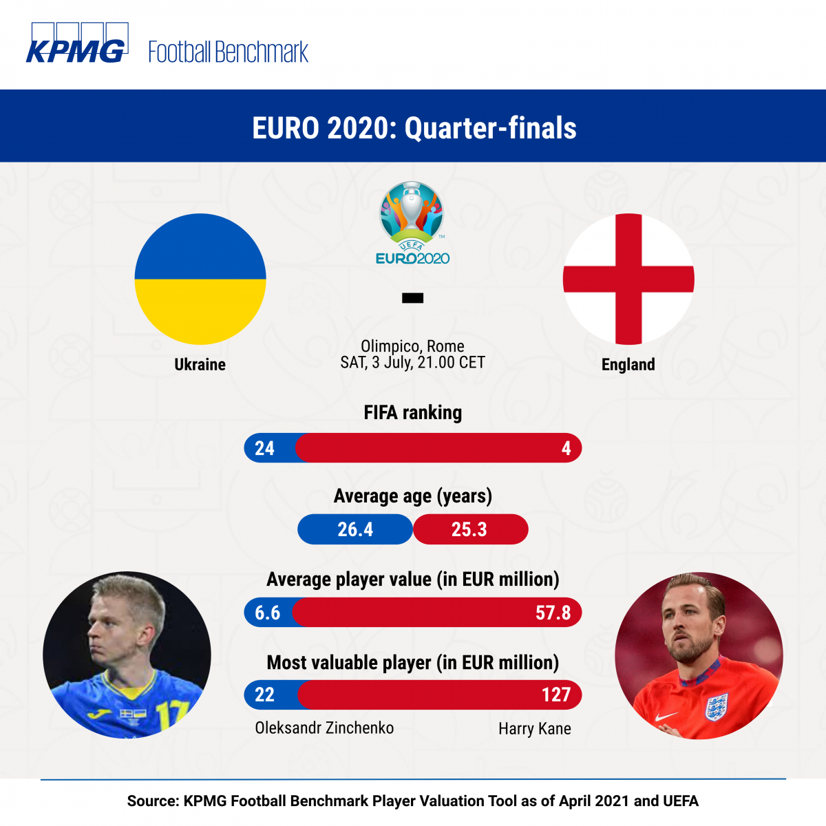В ¼ финала Евро-2020 Украине предстоит встретиться со сборной Англии, самой дорогой командой, дошедшей до этой стадии турнира. Средняя стоимость футболиста английской сборной составляет €57,8 млн.