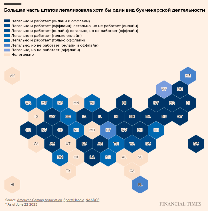 На текущий момент игроки могут легально делать ставки на спортивные события в 34 штатах, а также в Вашингтоне, округ Колумбия. В 25 юрисдикциях они могут сделать это онлайн. В совокупности американцы с 2018 года сделали ставок на $245 млрд.
