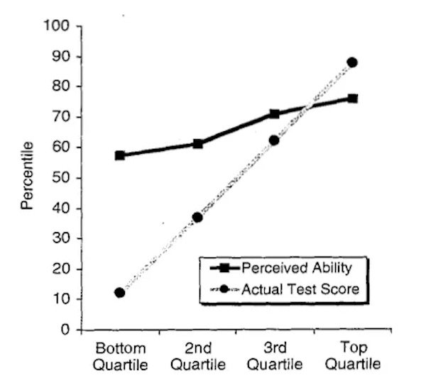 Еще одним продуктом чрезмерной уверенности в своих способностях по отношению к другим является эффект Даннинга-Крюгера. Дэвид Даннинг и Джастин Крюгер изначально проводили свое исследование с целью выяснить, как трудности в признании собственной некомпетентности приводят к завышенным самооценкам. Есть много интересных историй, которые показывают, как иллюзорное превосходство проявилось в повседневной жизни, но график ниже подчеркивает ключевые выводы Даннинга и Крюгера из их исследования: